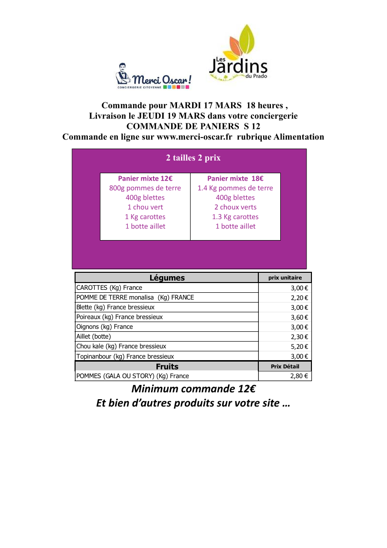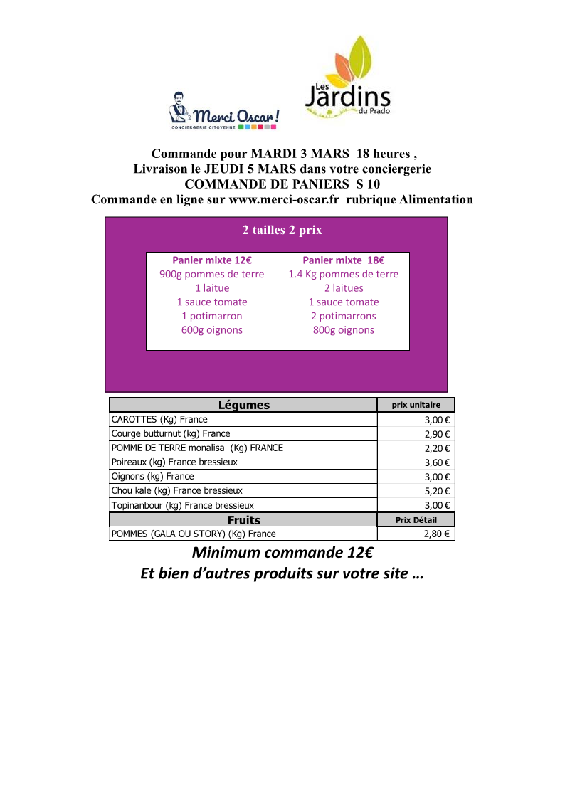 Commande du jeudi au mardi 18h. Livraison vers 11h le jeudi sur votre conciergerie.